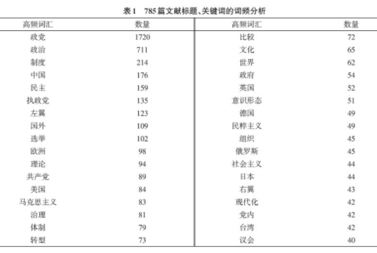 进一步,我们跨越学科界限,归纳中国比较政党研究的主题和聚焦的问题。通过对785篇文献的标题、关键词进行词频分析,得到表1所示的结果,其中已经删除了虚词和论文常用词,显示了频数大于等于40的词汇。通过将拥有共同高频词的文章聚类,根据研究聚焦的问题与探讨的重点,将中国比较政党研究划分为五大主题,每个大的主题下又分为小的子主题,并分析不同主题的研究内容与理论取向。