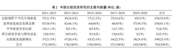 2.研究内容丰富,理论性、原创性成果比例提高。中国比较政党研究的内容包含了政党相关概念、政党组织、政党制度、政党与社会、政党与国家、政党执政、政党间关系、政党自身建设等。这些研究既有较为宏观的分析,也有从某个层面切入的微观考察,呈现出中国与世界、理论与实践、历史与当下的多重指向。与此同时,随着经验的积累,国内学者对中国政党模式独特性、比较政党创新理论与前沿问题的研究实现了由少到多,由浅入深的发展;提出新概念,运用新视角、新方法的原创性文章比例增多。
