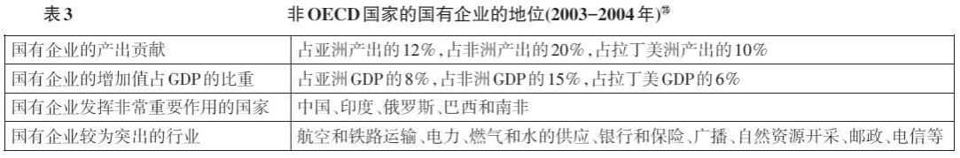 在发展中国家,国有企业有着更重要的地位。在《福布斯》杂志发布的2010-2011年度全球2000家最大上市公司中,有204家是国有企业,在数量上中国排名第一(70家),其后分别是印度(30家)、俄罗斯(9家)、马来西亚(8家)。表3是OECD统计的关于非OECD国家国有企业地位的基本情况。