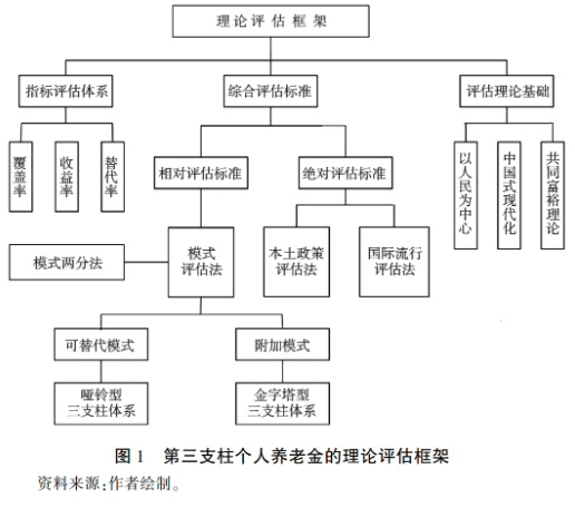 本文提出的理论评估框架由三个部分构成,除上述“综合评估标准”以外,还包括“指标评估体系”和“评估理论基础”。其中,“指标评估体系”下设覆盖率、投资收益率、替代率等三个传统指标要素;“评估理论基础”则是评估中国个人养老金覆盖率、构建“模式两分法”和“评估两分法”、确立2035年多层次、多支柱养老保险体系发展目标的理论基础。由此看来,本文构建的评估框架是中国话语体系下构建中国特色社会主义养老金体系必然逻辑的结果(见图1)。
