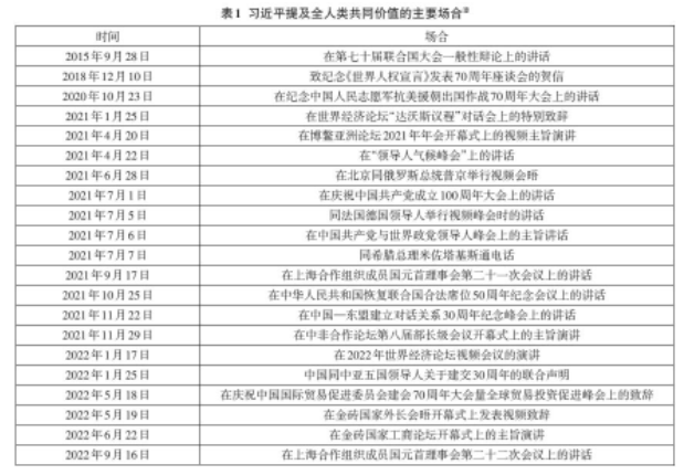 全人类共同价值这一理念创新是中国给世界提供的观念公共产品,需要倡导和推广,并把它嵌入到国际社会之中,使之成为全球治理的价值坐标。自从这一理念提出后,习近平在全球地区双边等不同场合都对其进行积极倡导弘扬(见表1),让更多的国家理解和接受了这一理念,为改革和完善全球治理提供了合法性,占据了国际道义制高点。