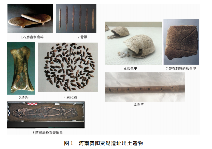 1.黄河中下游地区 该区域主要种植粟和黍,同时兼种水稻。河南舞阳贾湖遗址距今约8000年,面积5万多平方米,发掘出土了数十座房址和数百座墓葬以及丰富的陶器、石器(图1:1)、骨器(图1:2、3)、炭化稻(图1:4)和迄今年代最早的家猪。居住址和公共墓地内墓葬的规模及随葬品显现出差别,少数墓葬规模比一般墓葬略大,随葬绿松石装饰(图1:5),有些墓主人腰部随葬多件内装有小石子的乌龟壳(图1:6、7),有的龟甲上有刻划符号,其中有些符号与殷墟出土的甲骨文相似。墓葬中出土用鹤类翅骨做的骨笛(图1:8),有五孔、六孔、七孔不等,共数十件。研究者对其中一件七孔笛进行了测音,发现音阶准确,至今仍可以演奏乐曲。
