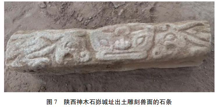 陕西神木石峁巨型城址的年代约距今4100至3800年,是一座面积达400万平方米、用石块包裹土芯砌筑的山城。该城址由外城、内城和皇城台构成。皇城台位于城内高处,可以鸟瞰全城。皇城台内有面积达上千平方米的大型宫殿建筑、宽阔的广场以及通向城内的高大门楼和道路。近年,在皇城台台基边缘墙体的石块中,发现了雕刻有兽面及各种动物形象的石条(图7),有的纹饰与商代青铜器的饕餮纹十分相似。这座依山而建的城址具有强烈的军事色彩,在外城和皇城台城门附近,都发现用于阻止敌人进攻的防御设施——瓮城,外城城墙外侧还设置多处突出于城墙外侧的附属设施——马面和位于转角处的角楼等防御设施。这一发现将这些防御设施开始出现的年代较原来的认识提早了两千年。石峁遗址的一系列发现表明,在距今大约4100年前后的夏王朝建立前夕,陕北地区的阶级分化已相当严重,已经出现了掌握强大军事力量的王权。