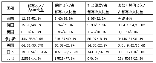 以下是若干有样本意义国家2019财政年度以本国货币计算的GDP、广义政府预算收入及其构成比例(图1,单位:千亿):[21]