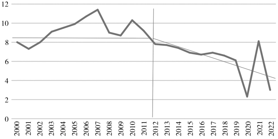 当前,就中国在未来较长一段时期内是否具备中高增速水平的这个重大问题而言,最为容易引入歧途的理论假说,即一国的经济潜在增速水平理论假说以及一国在经济发展过程似乎不可避免的经济潜在增速水平的边际递减效应规律。按照经济潜在增速的标准定义,一国(或地区)经济所能生产的最终商品和劳务数量的增长率,或者说一国(或地区)在各种资源要素得到最优和充分配置条件下,所能达到的最大经济增长率。当然,这里所说的一国资源要素概念是广义范畴的,既包括各种形式的自然资源,也包括人力资源、技术和管理,甚至还包括制度安排和经济政策等。依据该理论假说,随着一国GDP规模的持续扩张,特别是在一国人均GDP水平进入高收入或发达国家行列之中,由于各种资源要素的利用效率已经得到充分释放,除了技术进步等因素之外的一般资源要素报酬边际递减规律起到了主要作用,进而造成一国经济潜在增速水平必然出现持续性下滑,从而造成一国经济增速水平的持续性下滑。从中国2000—2022年期间GDP同比增速水平的变化趋势来看,似乎可以将中国在进入2012年之后GDP同比增速水平的持续性下滑现象,是由中国经济在从低收入国家进入中等偏上收入国家阶段后的经济潜在增速水平下滑规律决定的(图1)。