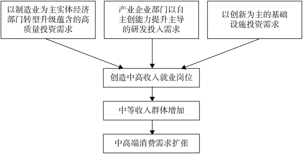 第二,“产业企业部门以自主创新能力提升主导的研发投入扩张→创造中高收入就业岗位→中等收入群体增加→中高端消费需求扩张”的传导机制。创新投资的本质是依附于人力资本和高技术含量生产设备、零配件和元器件等载体的投资活动,是连接“投资需求→消费需求”良性循环的不可或缺的重要机制。中国经济已经进入了自主创新驱动发展阶段,尤其表现在以制造业为主的实体经济部门自主创新能力的全面提升方面。这就要求中国以制造业为主的实体经济部门本土企业,必须在全产业链供应链的所有环节均进行持续性研发投入,尤其是要在原始创新、关键核心技术创新、颠覆性技术创新、关键共性技术创新等领域进行巨额的前期研发投入。这些以本土企业研发投入为主的创新投资,必然会创造和释放大量的中高收入就业岗位,从而促进中国以高人力资本为主的中等收入群体增加,进而促进中国的中高端消费需求扩张。这就必然会为中国的经济增长动力机制带来“中高端消费需求扩张↔创新研发投资扩张”的独特循环机制。