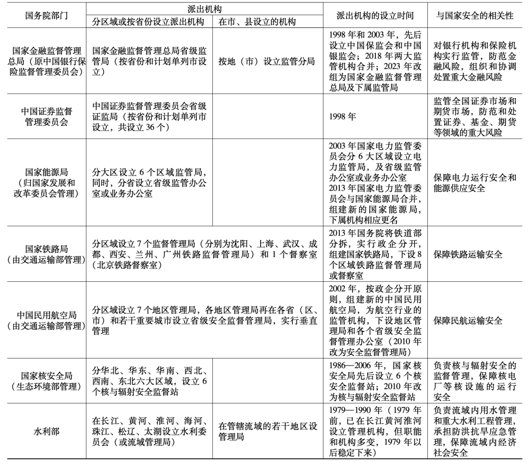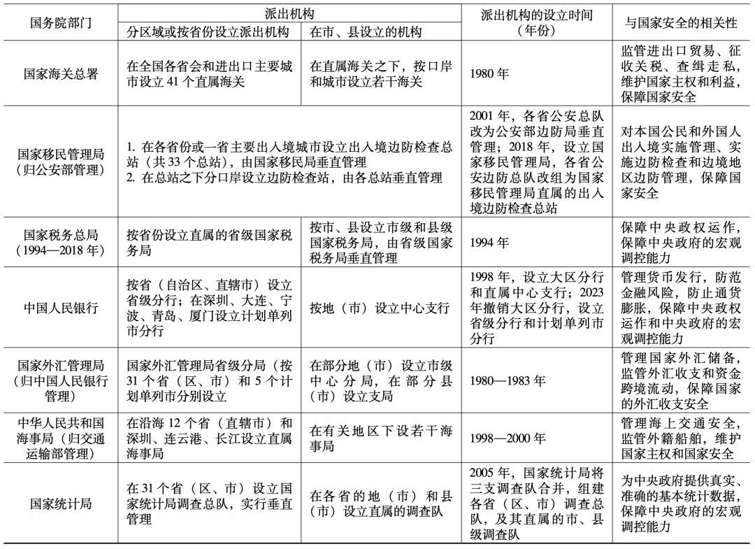 表1列出了与国家安全直接相关的领域,国务院下属部门在地方设立派出机构,所建立的中央垂直管理的治理系统。