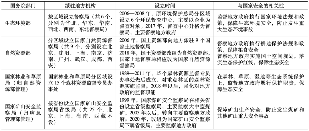 第三种类型是中央主管部门在地方设立督察或监察机构,实行垂直管理,目的是督察或监察地方政府履行某个领域的治理责任。表4列出了2023年国务院主要部门派驻地方的督察(监察)机构,以及与国家安全的相关性。