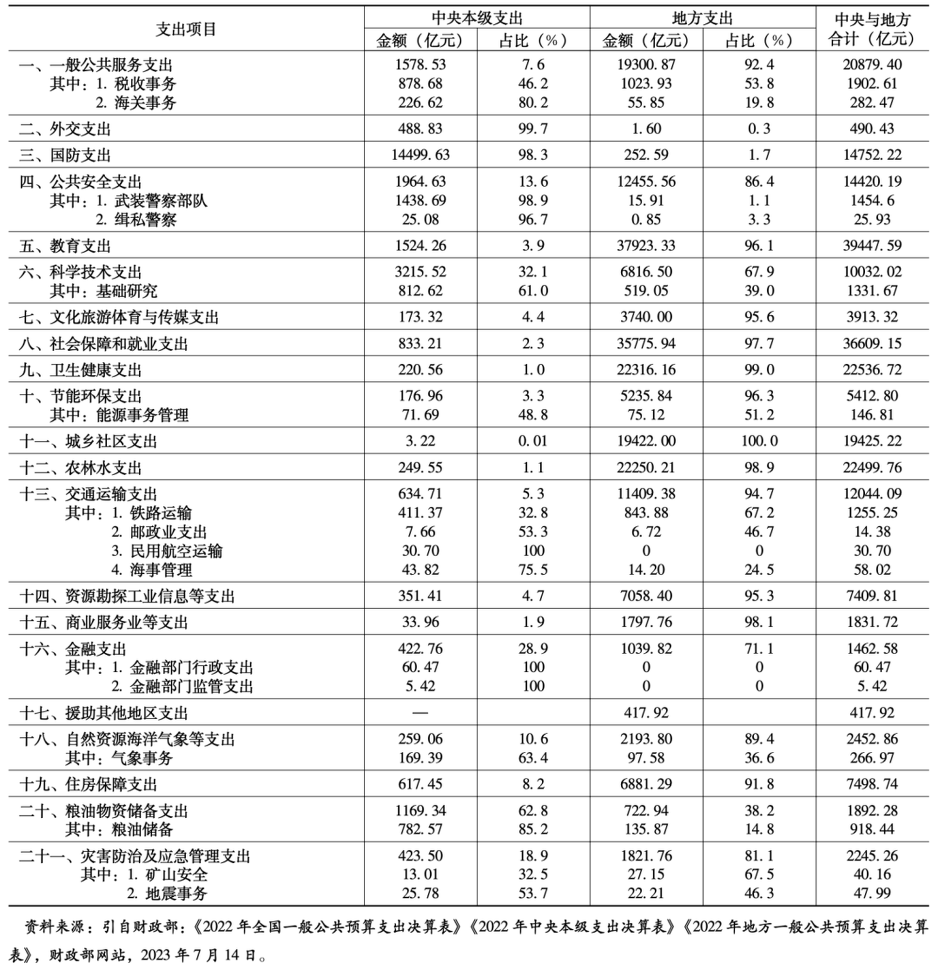 表5 2022年全国一般公共预算支出及中央与地方所占比重