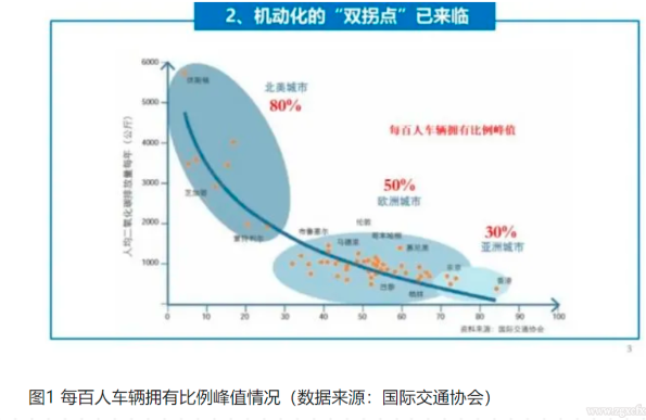 图1中分别显示了亚洲城市、欧洲城市与北美城市三类城市由于每百人车辆拥有比例不同,使得每年人均二氧化碳排放量也大为不同。当前,不少相关专家预测我国未来每百人车辆拥有比例将会向北美城市看齐,即每百人约拥有80辆车,而实际上根据国际交通协会的资料显示,亚洲城市每百人车辆拥有比例的峰值只有30辆,即约等于一个家庭一辆车,欧洲国家城市的峰值则是每百人拥有50辆车。造成这一明显差异的根本在于亚洲、欧洲和北美对于城市紧凑度的相差极大。亚洲城市属于高紧凑度,而北美城市则是属于蔓延式,城市布局分散,每平方公里建成区仅有2000人口。这就使得公共交通无法为北美城市居民提供便利的服务,使得他们的家庭几乎人均需要一辆车。而从实际来看,我国城市的高紧凑度(每平方公里建成区一万人口)使城市居民仅仅通过公共交通就能满足大部分的出行需求,因此,在我国一个家庭一辆车的比例已经成为主流。另一方面,如图2所示,新能源车取代燃油车已经成为各国机动车发展目标的普遍共识,中国也将紧随其后,势必会出台燃油车禁售时间和新能源汽车发展目标。综合以上两个方便,我国的机动化“双拐点”已经形成,这必将为市场和城乡发展带来巨变。