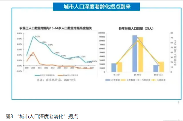 人是城镇化过程中最关键的要素,人口结构的变动亦是县城研究的重要背景之一。如图3所示,根据联合国统计数据以及历次人口普查数据,我国社会人口结构正在迈入老龄化阶段,城市人口深度老龄化的拐点已经到来。根据国家统计局资料显示,我国农民工人口数量增幅与15-64岁人口数量增幅高度相关,并且适龄农民工人口数量已于2013年正式迈入负增长阶段。城市人口深度老龄化拐点的到来,不仅意味着我国人力资本价格上升、用工成本提升,而且人口红利的消失也将越加明显,而这也将倒逼行业进行产业升级、实现自动化生产。