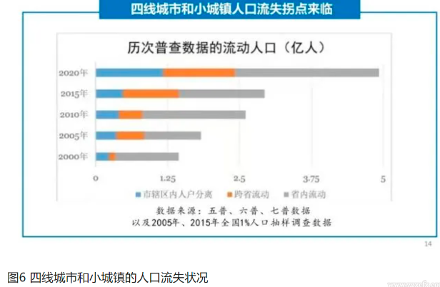 我国城镇化建设的短板在县城,对比国外发达国家,我国县城建设还处于现代化水平低、基础公共服务不完善的阶段。李克强总理曾在工作报告中也指出小城镇中“环境污染、管理不善、人居环境退化、就业不足等问题普遍存在”。历年人口普查数据从人口流动角度揭示了这个问题——十年间,我国小城镇居住人口减少了10%,如图6所示,市辖区范围内“人户分离”的趋势加剧、城市与城市之间的人口流动数量快速增长,省际流动人口基数也随着高铁的普及而越来越庞大。小城镇的衰退和人口流失,不仅会导致大量人口涌入大城市,加剧“大城市病”,也会弱化小城镇作为“三农”服务总基地的作用,影响农业现代化进程。