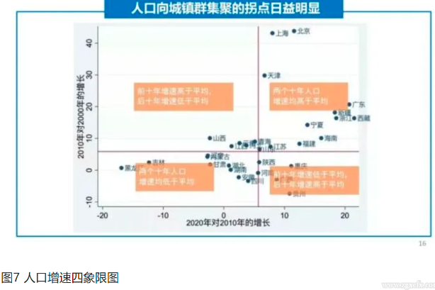 当前,我国已提出规划建设多个城市群,基于长三角、珠三角、粤港澳大湾区等城市群所拥有的完整庞大的产业链和企业集群,我国人口也呈现向城市群集聚的拐点。在图7中,根据六普与七普调查数据所形成的“人口增速四象限图”也直观反映了全国各省、直辖市之间人口流动的趋势差异。其中,在人口强流动背景下,处于第一、第四象限的地区人口增速高于全国平均值,这类城市应抓住发展机遇、吸引更多人口集聚。而处于第二、三象限地区的城市正面临紧缩型城市的拐点。在这四个象限中的县城也应有不同的应对策略,以适应形势的变化。