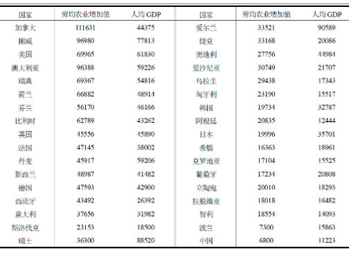 当然,任何国际比较都受限于数据可得性。由于缺乏数据,对某些可能属于农业强国的国家的遗漏,也是在所难免的遗憾。此外,即便进入这个排列,甚至排位也相对靠前,但是,受未能考虑到的其他因素的影响,不排除把算不上农业强国的国家置于其中的可能性。于是,本文拟进行的国际比较,旨在表明这些处在高收入阶段的国家具有较高的农业劳动生产率,而且,其农业经济并非微不足道。