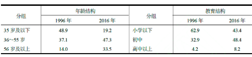 数据源:1996年的年龄结构数据来自《全国农业生产经营单位农业从业人员年龄分布及其构成(1996年底)》,https:// www. stats. gov. cn/ sj/ pcsj/ nypc/ dycn ypc/ 202302/ t2023 0221_ 1915 262. html;1996年的教育结构数据来自《全国农业生产经营单位农业从业人员文化程度及其构成(1996年底)》,https:// www. stats. gov. cn/ sj/ pcsj/ nypc/ dycn ypc/ 2023 02/t2023 0221_ 1915 260. html。2016年资料来自《第三次全国农业普查主要资料公报》表5-2,https:// www. stats. gov. cn/ sj/ pcsj/ nypc/2023 02/U0 2023 0223 5312 7376 9774. pdf。