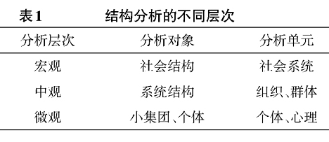 微观的结构主义分析,对准的是组织或者个体结构,个人或心理是分析单元。这种分析天然地与微观主义方法结合在一起,更多时候以一种“内在论”的形象示人。它不牵扯外在的行动者,而是局限于小集团内部或者人的身心活动。在社会科学诸领域,这种微观结构的分析多见于集体行动分析、心理学分析。例如小集团中的支配者与其他人之间是一种什么样的关系?再如,人的精神心理活动受到内生遗传因素还是外来创伤因素支配?只要因素之间存在稳定或被挑战的关系,他(它)们又何曾离开过结构?批评者们拒绝承认的只不过是中观或宏观的结构,与此同时,他们又不想对微观关系冠以“结构”之名,以此避免向结构主义妥协罢了。综上,结构分析的不同层次类型可列表为如表1。