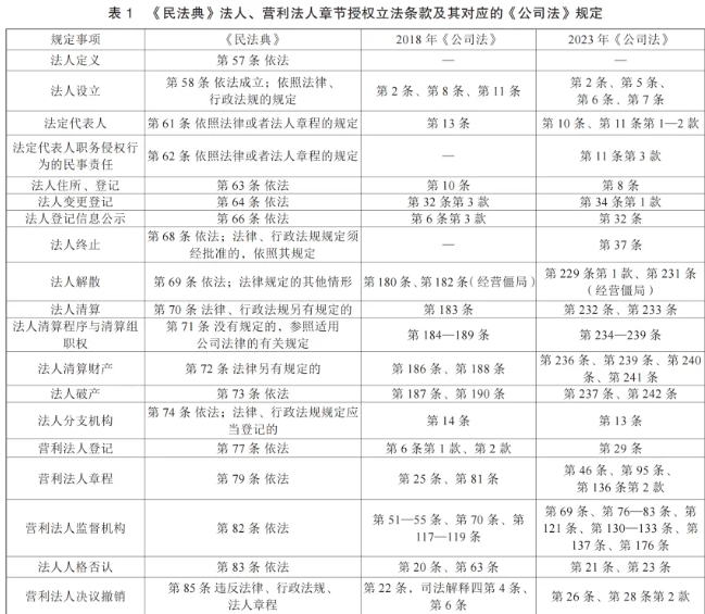 例如,《民法典》对个人信息原则上只作授权规定,便为此后的《个人信息保护法》的立法提供空间。《民法典》在与《公司法》有关的法人一般规定、营利法人一般规定(第57—86条)中,授权规定更加多见,其中计有19条带有“依法”“法律另有规定”表述的规则,包括法人成立或设立,法定代表人的资格、地位和责任,法人住所,法人变更和消灭,营利法人的登记、章程、监督机构、人格否认、决议撤销等规定(具体参见表1)。