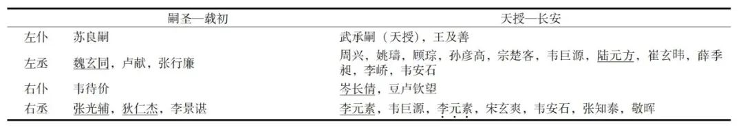 尚书省上层的人事,如表1所示(分为武则天垂帘听政与称帝两个时段):