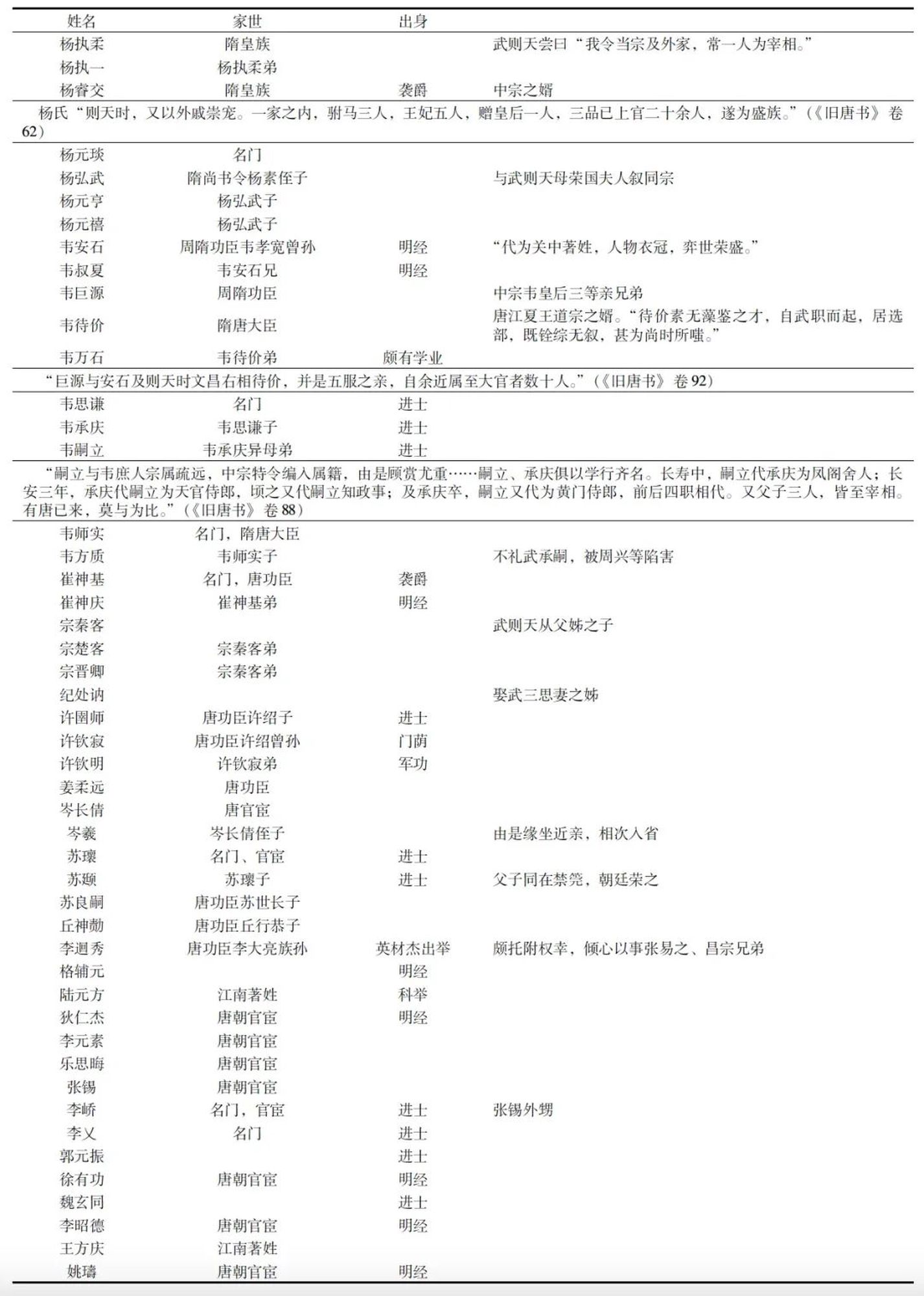 作为武氏子弟集团的附庸,可以加上宗秦客、宗楚客、宗晋卿和纪处讷四人。前三人为武则天外甥,纪处讷则是武三思的连襟。