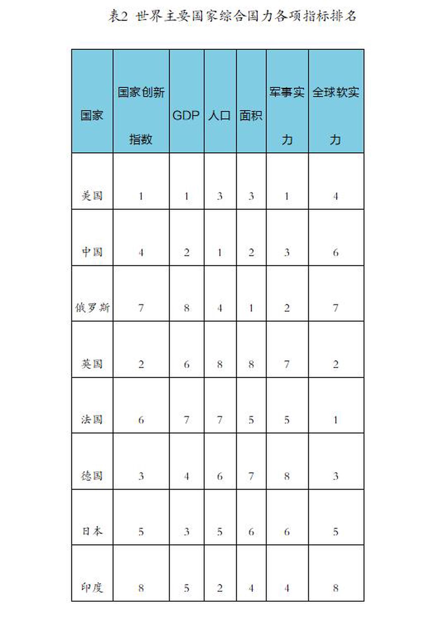 将美国、中国、俄罗斯、英国、法国等8个大国的各项指标数据由1至8进行排名,得到如下表格:
