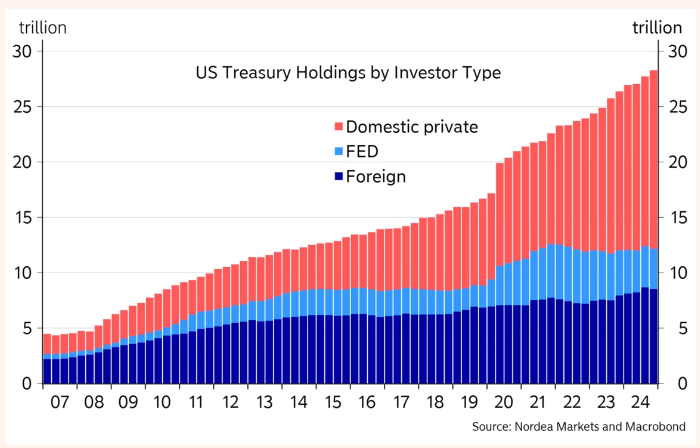 所谓“世纪债券”的设想很可能导致美元国际货币体系的崩溃。图为2007-2024年美国国债持有者。深蓝色为外国持有者;浅蓝色为美联储持有;红色为美国国内私人持有者