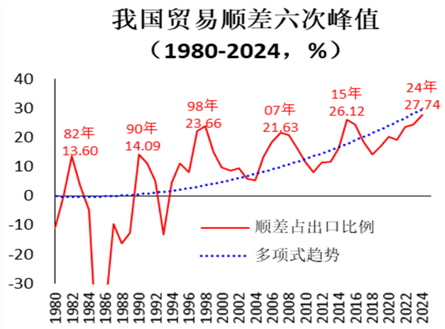 观察改革时期我国货物贸易顺差占出口比例变化,会发现该指标在趋势性上升过程中经历六个高点,代表我国开放型经济构建和成长进程中贸易平衡形势变动的周期性特点。