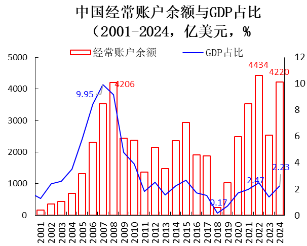 特征一:经常账户总量创新高,但是顺差占GDP比例仍在大体正常范围。从宏观角度看,观察一国外部平衡形势,基础性指标之一是经常账户平衡情况。十四五前四年(2021-2024)我国年均经常账户顺差金额是3678亿美元,是十三五时期年均1512亿美元的2.43倍,也超过了十一五时期年均顺差峰值2973亿美元两成多。