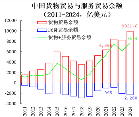 特征二:贸易顺差及GDP占比均较大幅度上升。近年我国货物贸易顺差大幅飙升,2024年达到9921亿美元,十四五前四年年均达到8222亿美元,比十三五年均顺差4451亿美元超过84.7%。我国服务贸易持续处于逆差,十四五前四年年均逆差1550亿美元,比十三五年均2377亿美元下降34.8%。结果贸易总顺差从十三五时期的2074亿美元增长到前四年年均6672亿美元,增幅两倍多;贸易总顺差占GDP比例为3.67%,远超十三五的1.34%。