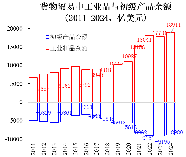 同时我国初级品贸易逆差2024年也大幅增长到8989亿美元,四年的年均值为8897亿美元,比十三五年均5012亿美元增加3885亿美元,增幅为77.5%:初级品逆差增量绝对值约为制成品顺差绝对值一半,其逆差增幅也略小于制成品顺差增幅。