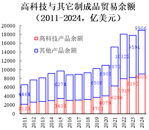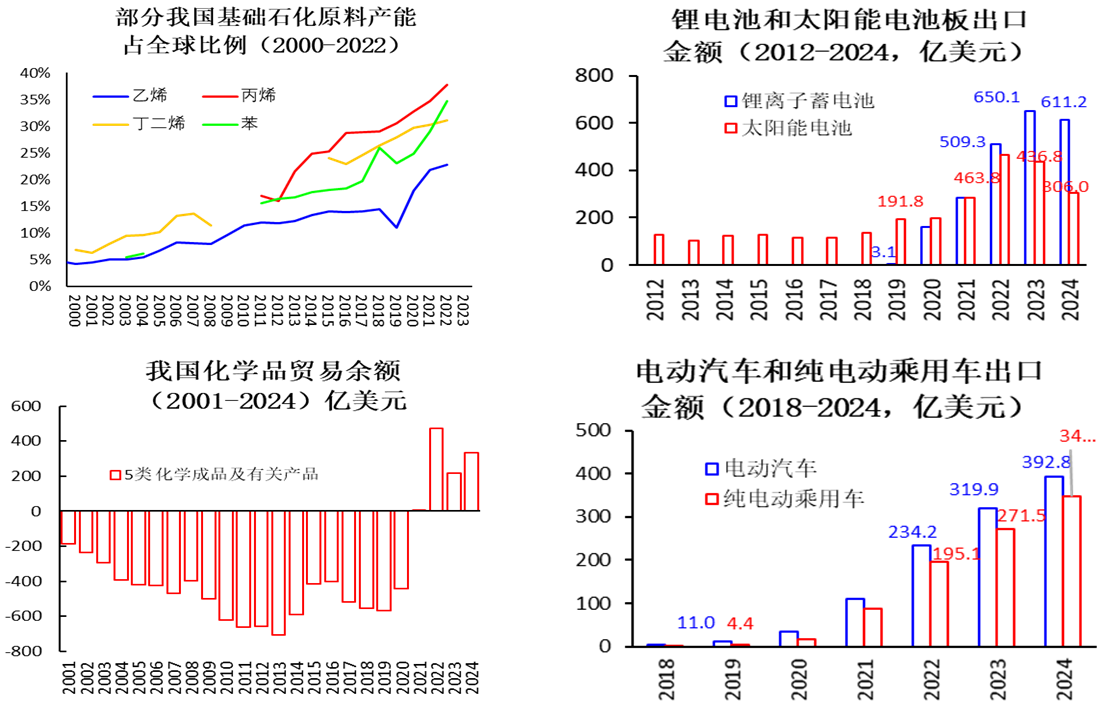 特征四:在制成品内部,高科技制成品顺差加速猛增,同时传统行业包括中低端部门顺差也快速增长。十四五前四年平均每年高科技制成品顺差7850亿美元,比十三五时期的年均3423亿美元年均值增加了4427亿美元,增幅一倍多。如电动汽车、锂电池、太阳能电池“新三样”部门,2018年出口加总不到150亿美元,2024年出口达到1310亿美元,创造顺差增量1000多亿美元。又如化工基础原材料行业由十三五时期年均逆差约500亿美元,转变为十四五前四年年均顺差258亿美元。