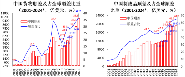 从大国竞争角度观察,我国经济实力增长特别是供给端竞争力提升,对韧性应对外部冲击提供了坚实保障,为反制美方单边霸凌提供了有力支持;然而在国内需求偏弱与贸易顺差过大背景下,亟需提振消费与内需推进经济再平衡,有效应对美方安全与关税“两伞合一”制衡战略。下面侧重考察近年外部顺差扩大的结构性失衡特点和原因,并结合外部环境演变探讨我国应对策略。