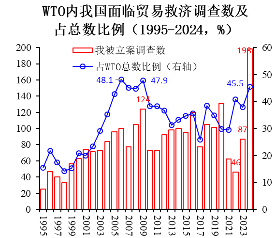 2021-2022年我国在WTO内遭遇贸易调查数处于低位,这两年贸易争端数快速回升,尤其是2024年达到198起的创记录水平,比2009年的历史峰值124起跳升59.7%。剔除针对中国的全球WTO内贸易争端案例情况,相关指标近两年也大幅回升,2024年达到237起,不过只是该指标在历史上的第五高年份,比历史峰值309起仍低30.4%;实际上2024年我国面临争端增量111起,占2024年全球增量206起的53.4%。可见去年我国在WTO内面临前所未有的贸易调查数,既是全球经贸关系紧张普遍形势的产物,也在一定程度上是我国特有现象。