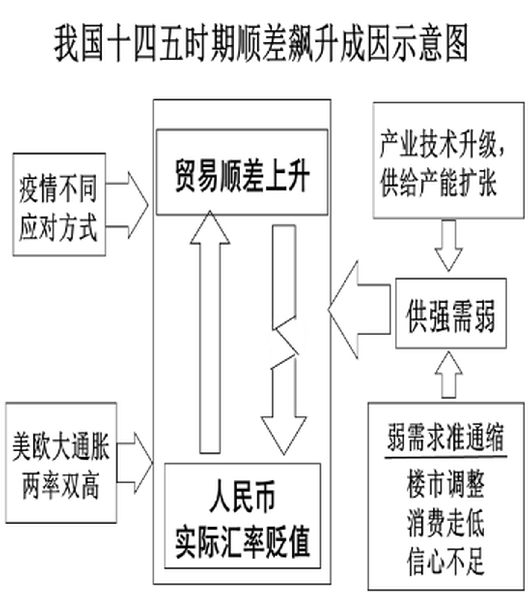 总起来看,十四五时期我国贸易顺差大幅增长和结构性不平衡表现,不应仅被看作是本币实际贬值派生的短期宏观现象,而是在疫情冲击与外部通胀影响下,新兴大国经济阶段性供大于求或“供强需弱”矛盾在对外经济关系领域的投射,提示需采用内外统筹方法,通过综合实施扩内需、增收入、促消费政策加以调节。