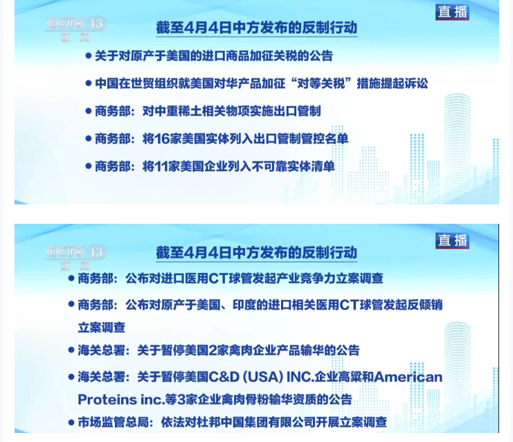 2025年4月2日,美方宣布对所有贸易伙伴征收“对等关税”,次日中国商务部新闻发言人就明确表示,“中方对此坚决反对,并将坚决采取反制措施维护自身权益。”4月4日,中方有关部门接连表态并发布回应措施:包括对原产于美国所有进口商品在现行适用关税税率基础上加征34%关税,在世贸组织争端解决机制起诉美方对华产品加征“对等关税”措施,发布对7类中重稀土相关物项实施出口管制措施的公告,决定将16家美国实体列入出口管制管控名单禁止对其出口两用物项,将11家美国企业列入不可靠实体清单实施制裁,对原产于美国、印度的进口相关医用CT球管发起反倾销立案调查,暂停美国2家禽肉企业产品输华,暂停美国C3家企业禽肉骨粉输华资质。