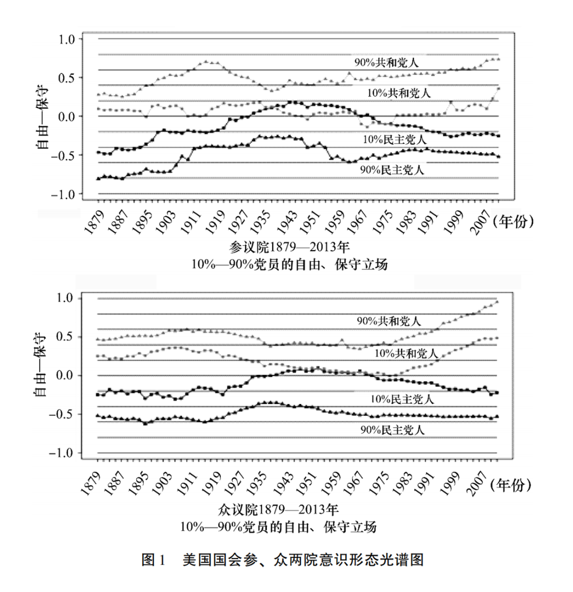 关于精英极化,从美国国会内部的对比分析来看,无论是参议院还是众议院,议员们的极化态势不仅明显,而且日趋严重。从美国国会参、众两院意识形态光谱图来看(如图1所示),美国90%的共和党和民主党人,其立场已分别向保守和自由两端漂移。而在20世纪70年代,比较活跃的是中间派和摇摆派,即10%的共和党人和民主党人之间的交集却越来越少。这也意味着,那些倾向自由立场的温和的共和党人和倾向保守立场的折中的民主党人已遭到集体性政治清洗。