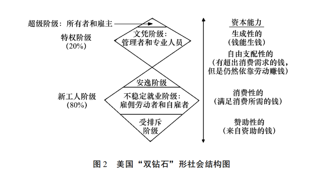 第三,从社会的路径来看,社会结构的颠覆性变革和社会阶层的革命性重组是引发政治极化的重要因素。按厄尔·怀松(EarlWysong)等人“双钻石”形社会模型的分析,随着贫富差距的拉大和中产阶级的瓦解,欧美各国一直引以为豪的橄榄形或纺锤形社会结构早已消失不见,取而代之的是由80%的新工人阶级和20%的特权阶级两个钻石构成的“双钻石”形结构(如图2所示)。两大阶级间通道狭窄,渗透性和流动性都极为有限,形象地描绘了当前美国阶层固化的趋势。