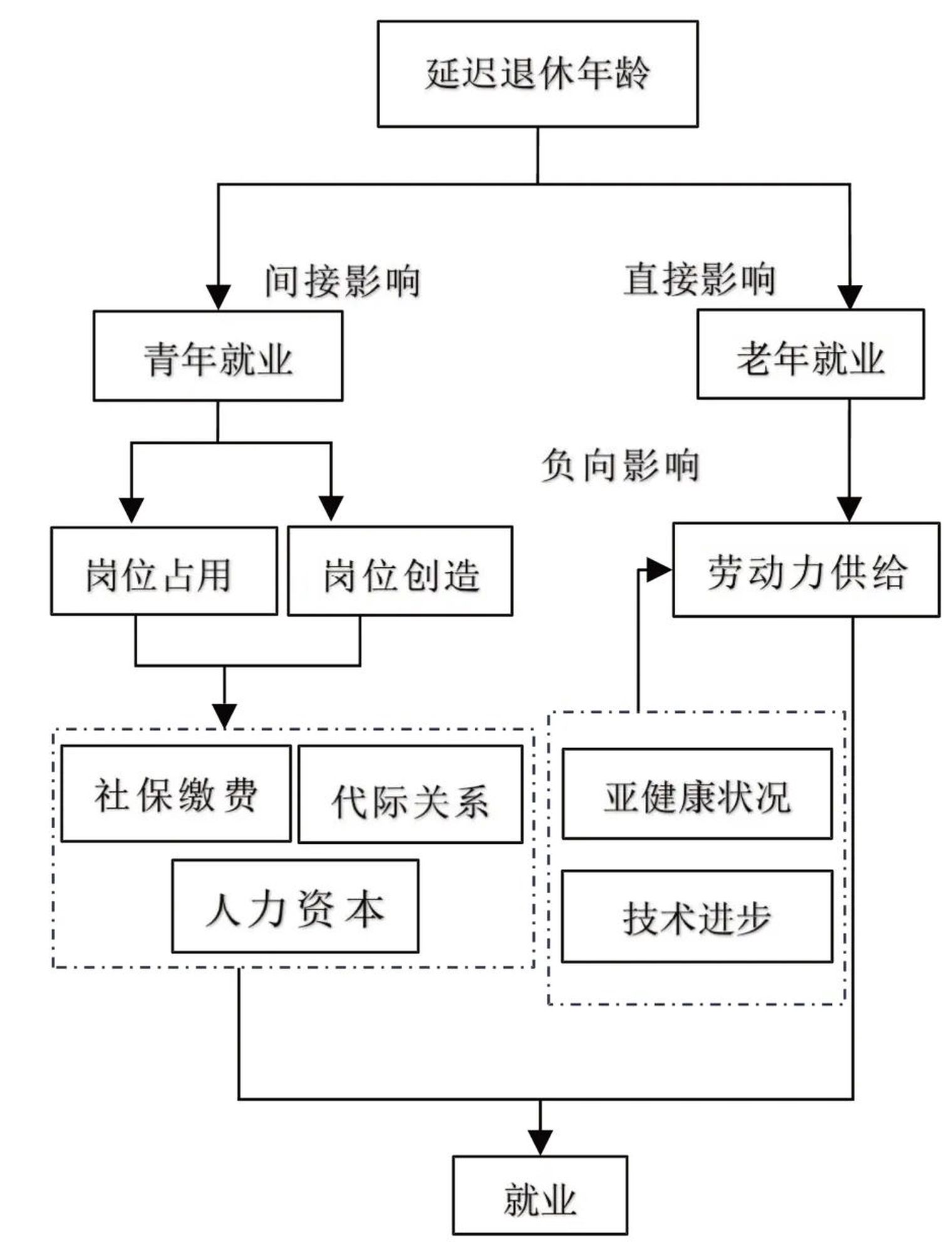 在短期内劳动力市场就业岗位总量基本恒定、劳动力同质性较高的前提下,延迟退休会影响青年就业机会。从社会保险来看,用人单位承担着较高的社会保险缴费比例,延迟退休意味着延长劳动力的社会保险缴费年限,为平衡成本和利益,企业倾向于减少劳动力的雇佣,无形中降低青年就业机会。从代际关系来看,年轻父母的劳动供给会受到照料子女的直接成本和机会成本的影响,延迟退休可能会减少祖辈对孙辈的照护时间,将子女的照料压力转移至父母身上,挤压青年在劳动力市场的时间和精力投入,进而减少青年劳动力的市场供给,尤其会影响年轻母亲的劳动供给。从人力资本来看,延迟退休对具有不同人力资本的老年人的就业影响存在异质性。例如教师、医生、高级技工等老年劳动力在岗时间久、经验丰富,具备较高的专用型人力资本,其延迟退休会对青年就业产生替代作用,减少青年就业机会和晋升空间,产生岗位占用效应。Dai和曾霞等利用实证分析均得出了延迟退休对青年人就业产生不利影响的结论。