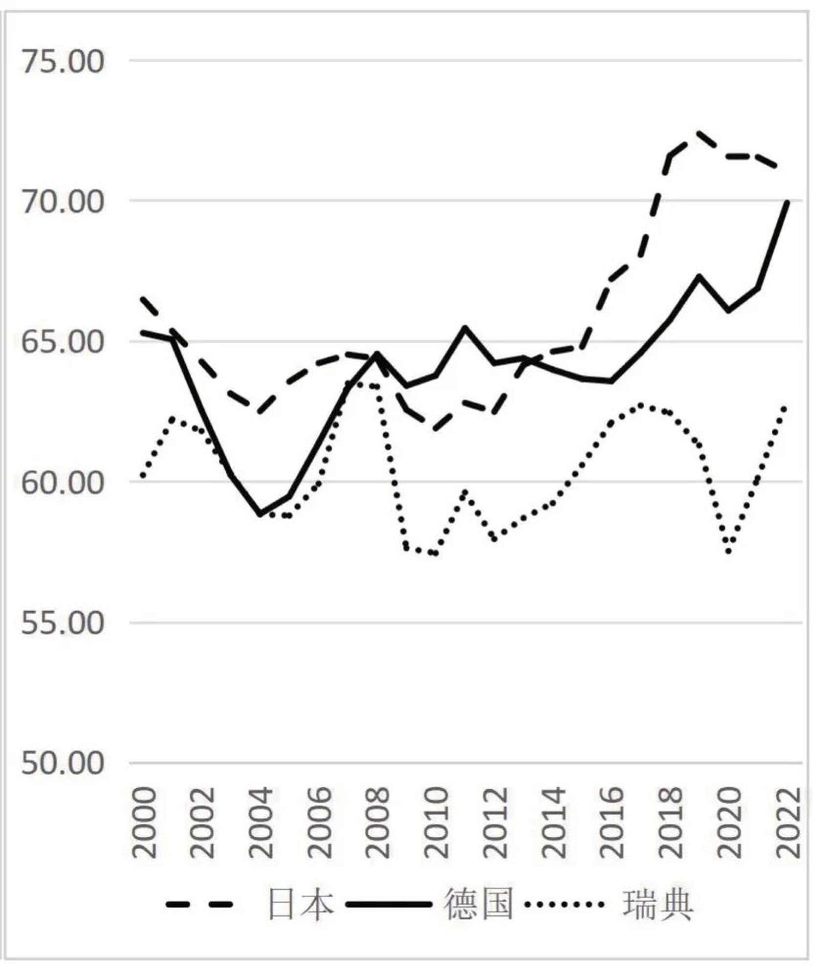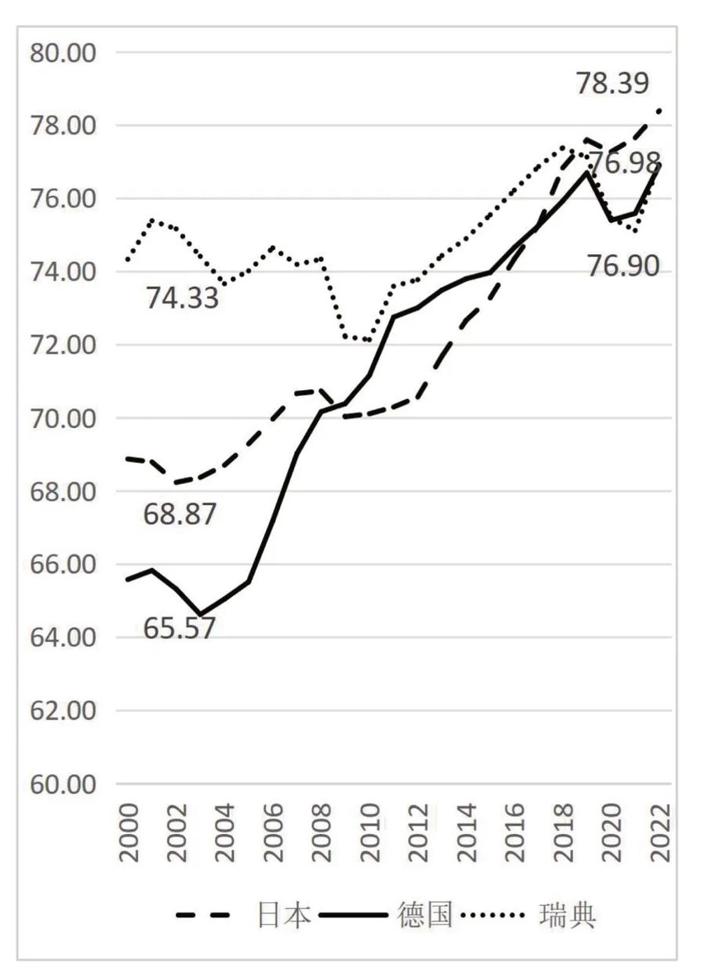 研究期内德国的就业率总体来看低于瑞典和日本,但与两国差距不断缩小,2000 年仅为65.57%,到2022 年高达76.90%。究其原因,一方面是因为20 世纪末21 世纪初德国高度的就业保护政策对解雇工人进行了严格限制,使得劳动力市场异常僵化,企业雇佣新员工会提高劳动力成本,抑制了正常市场行为;另一方面,德国的提前退休政策对劳动力市场的影响存在一定的滞后期,不符合提前退休的失业人员具有高替代率失业保险以及随后享有无期限的具备较高替代工资的失业救助,失业者缺乏重新进入劳动力市场的紧迫感,同时较低收入者为减少社会保险费的支出也会更倾向于失业金的领取,从而导致研究期初始德国的就业率保持在60%左右的较低水平。随后德国政府将提前退休转向延迟退休政策,并基本完成与其相适应的劳动力市场政策改革,例如延迟退休增发养老金、缩短失业金领取时长、放松雇佣限制等政策促进劳动参与率的提高,使德国劳动力市场快速发展,促使德国就业率飞速提升。