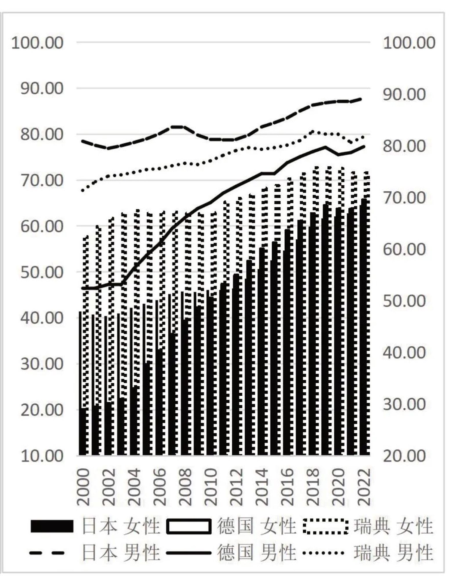 同时,日本的女性老年就业总体好于瑞典和德国,究其原因,日本受儒家文化的影响,传统性别分工的家庭形态在过去占据主导地位,《厚生年金保险》规定由统一男女领取年金的年龄转向单独推迟男性领取年金年龄,以此激励男性工作的更久,受此影响老年男性的就业率普遍高于女性。但随产业结构调整和西方文化冲击,性别分工的家庭形态已经开始改变,第三产业的飞速崛起为女性就业带来了大量岗位。伴随着家庭规模的日益小型化、生活成本的不断提高,以男性支撑整个家庭的经济模式无法承担家庭成本,女性开始大量进入劳动力市场。20 世纪末21 世纪初日本政府相继颁布的《男女共同参与社会均等法》《援助女性再就业计划》等也为老年女性就业提供了政策支持和法律保障,促进了老年女性就业率的提高。同时,日本人均预期寿命的延长也为女性老年就业提供了必要条件。2020年日本男性预期寿命为81.56岁,女性为87.71岁,且老年女性的健康寿命高于男性,较高的预期寿命和健康寿命也是老年女性愿意就业的重要原因。