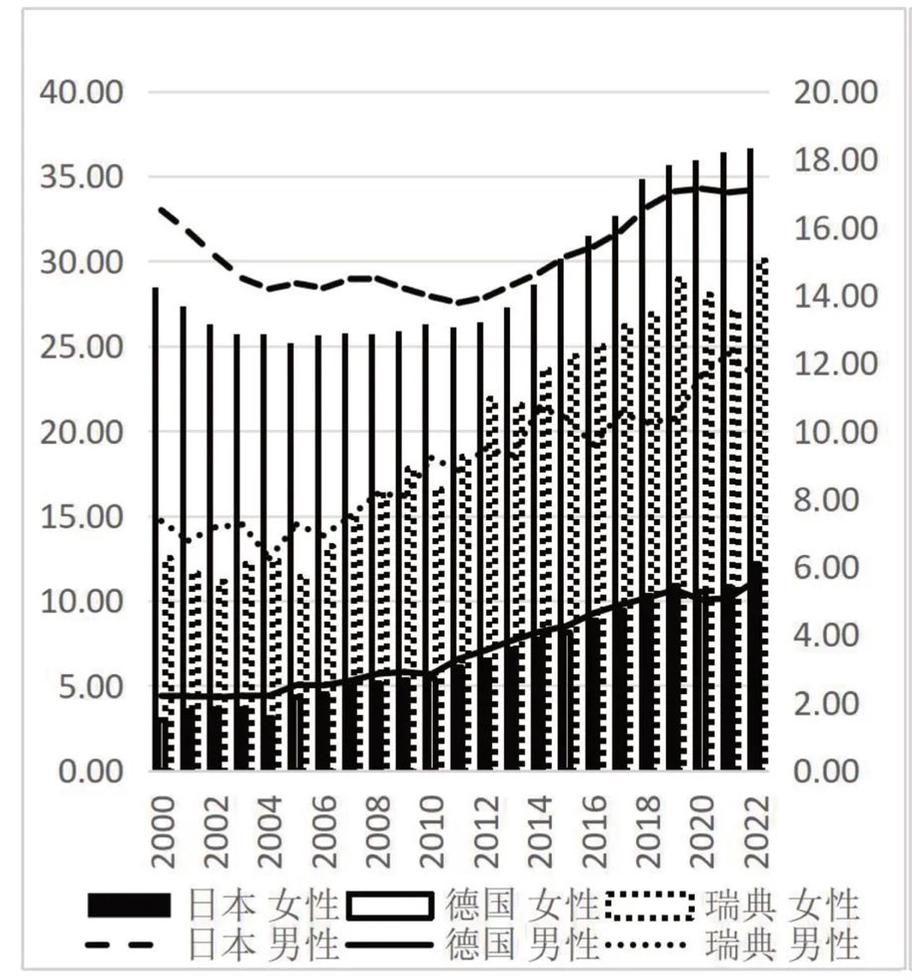 分性别来看,各国无论是55—64 岁人口还是65 岁及以上人口男性就业率均高于女性。其中,日本男性就业率始终高于瑞典和德国,55—64 岁人口的就业率与瑞典和德国差距较小,但在65 岁及以上人口的就业率中均高出10%以上,到2022 年两个年龄组就业率分别为87.74%和34.20%。瑞典55—64 岁的女性就业率普遍高于日本和德国,但在研究期内差距呈逐渐缩小的态势,分别由14.45%、33.42%缩小至6.18%、5.22%。65 岁及以上的女性就业率中,日本始终高于德国和瑞典,但差距远小于男性,研究期内与德国维持在10%以上的就业率差距,与瑞典的差距由7.98%下降至3.29%。2021 年后更是突破了18.33%的就业率,是德国65 岁及以上女性就业率的3 倍。总体来看,研究期末55—64岁人口的就业率差距较小,65岁及以上人口就业率存在较大差距,但女性就业率在两组间均呈现出上升趋势。19 世纪的个体化是以家庭为单位,依靠分工和团结使得家庭内部成员各司其职来维持家庭的正常生活。随着福利国家的发展,养老金使得老年人从子女家庭中独立出来,养老保险制度也让子女家庭摆脱了对父母的赡养义务,个体化的生计单位开始由家庭向个人转变。在以家庭为单位的时代,由于性别分工,女性被排除在劳动力市场之外,个体化带来了劳动力市场对女性开放门户的需求,让工作不再是男性的特权,被家务劳动束缚的女性劳动力在薪资劳动中获得“解放”,带来女性就业率的提高。