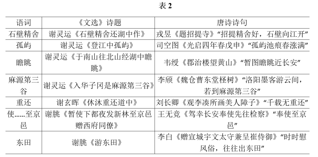 通过此表,可见唐人对三谢之推重,并非泛泛谩言。李白《与周刚清溪玉镜潭宴别》起首:“康乐上官去,永嘉游石门。江亭有孤屿,千载迹犹存。”分别“采用”谢灵运《石门新营所住四面高山回溪石濑茂林修竹》《登石门最高顶》《登江中孤屿》三则诗题。李群玉《送于少监自广州还紫逻》“鸣皋山水似麻源,谢监东还忆故园”,上句用谢灵运《入华子冈是麻源第三谷》诗题,下句用谢灵运《还旧园作见颜范二中书》诗题,皆可谓尽“采用”诗题之能事。