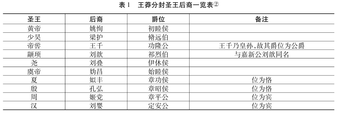 圣王后裔是除宗室、功臣之外,王莽于新朝初年分封诸侯的另一主要群体来源。始建国元年(9),王莽以黄帝、少昊等圣王“咸有圣德,假于皇天,功烈巍巍,光施于远”为由,颁布诏书对其后裔进行加封。《汉书·王莽传》中详细记载了王莽寻求到的圣王后裔及其受封情况,为便于下文分析,本文将此次分封之结果以表格的形式呈现于下(见表1)。