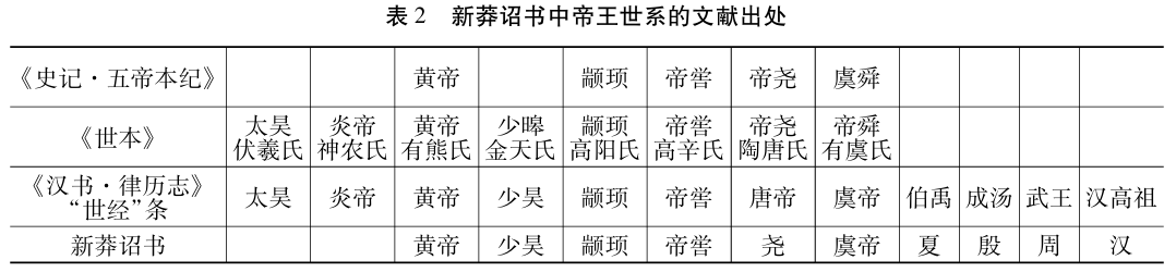 首先,王莽对于圣王后裔的选择严格遵循了原有文献记载的帝王世系。将《史记·五帝本纪》《世本》《汉书·律历志》三书所载帝王世系与新莽诏书中提及的圣王进行对比后可发现,除太昊、炎帝生存年代过于久远且不在司马迁所述五帝之列外,其余圣王均可在上述文献中寻找到出处。可见,王莽在选择分封对象之时正是以上述史料作为文献依据的(见表2)。