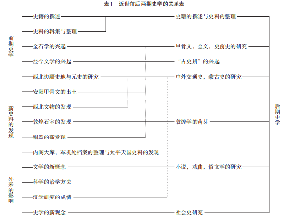 20世纪以来经历三四十年的创建和开掘,新史学整体面貌得以成型。以顾颉刚《当代中国史学》概括所言:“后期的史学的面目,是颇为新颖的。”之所以取得如此大的进步,他归纳为“几个助力”:第一是西洋的科学的治史方法的输入;第二是西洋的新史观的输入;第三是新史料的发现;第四是欧美日本汉学研究的进步;第五是新文学运动的兴起。他所指陈的后期史学是民国史学,以此与前期即晚清史学相对而言。这也正是上文所述“新史学”转型完成的时段。顾颉刚认为,中国新史学成就值得赞许,其在“门类之多、人材之众”方面,“都超出于其他各种学术之上”。值得关注的是,以考证史料见长的顾颉刚在总结史学成就时虽然“把新史学的成功,主要归之于新史料的开发”,却在史学的新观念认知上突出了“社会史研究”,如其所列“近世前后两期史学的关系表”所示(见表1)。