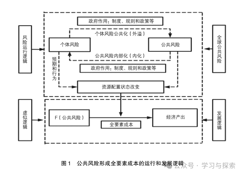公共风险产生的机制是个体风险公共化,并反过来改变个体行为预期,进而改变资源配置状态。社会实际的资源配置状态是根据公共风险作出的决策,公共风险水平越高,资源配置效率和使用效率越低。公共风险是个体风险公共化(或异化)的结果,例如,系统重要性企业的风险外溢,就可能引发多米诺骨牌效应,产生风险关联,导致风险系统化、公共化,甚至造成公共危机。个体既不能预测风险变化进程,也无法主动防范化解,只能是被动应对。因此,需要政府抑制个体风险的公共化。2008年国际金融危机之后,如何治理风险成为政府的一大挑战。从微观审慎监管到宏观审慎监管,就是意识到了个体风险隐蔽关联形成的多米诺骨牌效应。而当公共风险已经形成,并不断扩大时,公共风险会内部化为个体风险,例如,当出现金融危机时,个体风险(私人成本)会急剧上升,即出现公共风险内部化的现象,这会破坏市场经济的风险与收益匹配原则,改变经济变量的规模和结构,进而影响了实际经济增长。仍以金融危机为例,由于政府对市场风险演变的认知缺失,个体风险公共化得不到有效管控,从而演化为危机。这与政府认知、制度缺陷直接相关。从微观个体看,理性的风险防范措施,如次级债的资产证券化,会产生一个隐蔽的风险链条,参与者都是这条风险链上的“蚂蚱”,导致公共风险悄然形成,隐性合成谬误,使所有个体处于更大的风险之中。但个体理性就像二维平面上的生物,无法观察到这种三维的风险链,即使意识到了也无法解决。于是,个体风险向公共风险无边界转化,使得金融危机无法预测,也使得微观审慎监管失灵,宏观审慎监管也就由此而生。因此,金融危机的形成和化解充分说明了政府在其中的枢纽作用。在公共风险形成,及公共风险向全要素成本转化过程中,政府有机会通过制度创新来实现公共风险收敛。