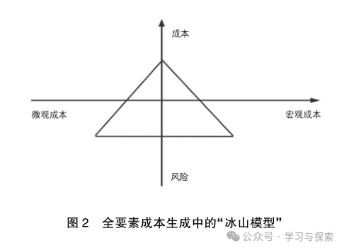 全要素成本不仅仅是一个经济现象,它更深刻地反映了社会经济运行的制度环境。制度构成了社会经济活动的框架和规则,它影响着资源的配置、风险的分配以及经济主体的行为选择。在全要素成本的形成和演变过程中,制度在全要素成本生成的状态中起到了至关重要的作用。在不同的制度环境下,经济主体面临的风险和不确定性程度是不同的,这直接影响了全要素成本的大小和构成。本部分运用冰山模型来解析全要素成本,强调制度在其中的重要作用,随后具体分析了全要素成本、公共风险与制度状态之间的关系。