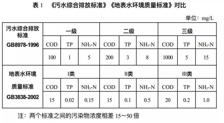 一是“达标排放”不能确保河湖水质改善。在点源污染控制方面,以往提出的要求是“达标”排放。并习惯性认为,“达标”排放对环境是安全的。即使按照污水一级排放标准控制,其排出的废污水水体也将劣于地表水V类。当一个地区的产业布局较密集时,其水污染物排放对河湖水质的危害是巨大的(见表1)。