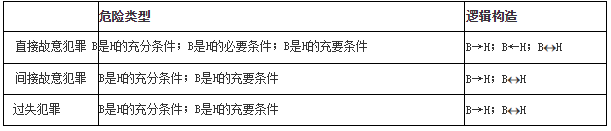 从“现实危险”上阐释结果犯的成立和未完成行为的定罪问题,关键是揭示现实危险的危险机制。刑法上因果关系的逻辑分析学说为“现实危险”的危险机制提供了理论基础,按照因果关系的逻辑分析学说,犯罪行为与危害结果之间应当是充分条件的因果关系,直接故意犯罪行为由于是积极追求危害结果的发生,所以即便其“危害行为”是危害结果发生的必要条件,直接故意的“犯罪行为”也是危害结果发生的充分条件,而充分必要条件包含了充分条件,因此,直接故意犯罪的危害行为与危害结果之间包括充分条件、必要条件和充分必要条件的因果关系;间接故意犯罪和过失犯罪的危害行为与危害结果之间包括充分条件和充分必要条件的因果关系,没有必要条件的因果关系。〔[14]〕以B代表危害行为,以H代表危害结果,据此形成了危险机制类型图(表1)。