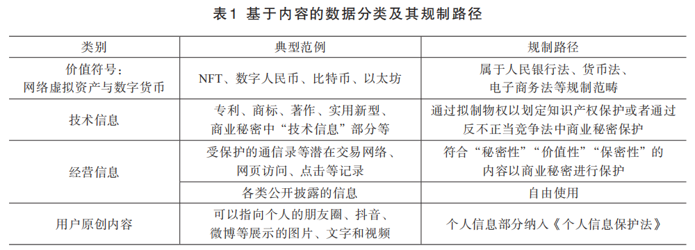 对数据进行产权赋权,首先应当明确哪些数据应当用产权来加以保护。现代产权理论认为公有产权下的个体都想多得收益而不愿多付出努力,因此造成了损公肥私的“公地悲剧”;私有产权是一种有效的激励机制,使得收益和成本由所有者承担,所以私有产权才是边界清晰、最有效率的产权形式。但如前所述,数据要素是一种虚拟商品,不是私人劳动的产物,因此不能按照私人劳动产品完全由生产或持有主体控制的逻辑去赋予其高度私有化的产权,进而“一刀切”地规定严格的产权规则,而是应当严格限缩赋权对象,避免造成数据壁垒。表1是目前几种涉及数据的资产类型及其主要的规制路径。