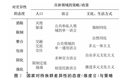 为什么是这样?第一,去族群化的国家肯定不会对差异性采取特别积极的态度,我们无法想象一个国家完全不按照族群分配任何权力和资源(甚至连族群身份都不识别),却采取各种措施固化、强化族群之间的文化差异。第二,去族群化的国家也许会通过限制差异性来巩固共同的公民身份、阶级成员身份,但这些身份中蕴含的整合力量也让国家没有必要采取消除差异性的极端措施。第三,在族群化程度极高的国家,分享国家权力的各族群不可能容许对差异性的消除。在表3中唯一可能存在的组合是“族群化程度极高+对差异性特别积极”,这两者会形成相互促进的正反馈:差异性的强化带来族群意识的强化,族群意识的政治表达加深国家的族群化,被族群因素“绑架”的国家又很难改变强化差异性的政策取向。
